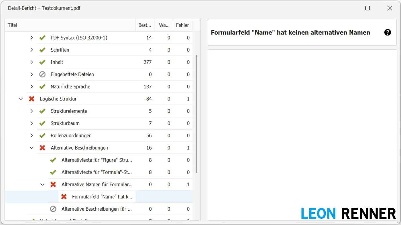 As soon as you save the document and check it again with the PDF Accessibility Checker, the error message Form field has no alternative name disappeared.