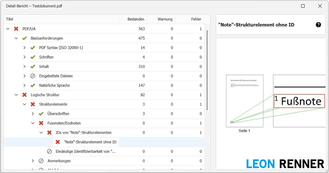As soon as you save the document and check it again with the PDF Accessibility Checker, the error message “Note” structure element without ID disappeared.
