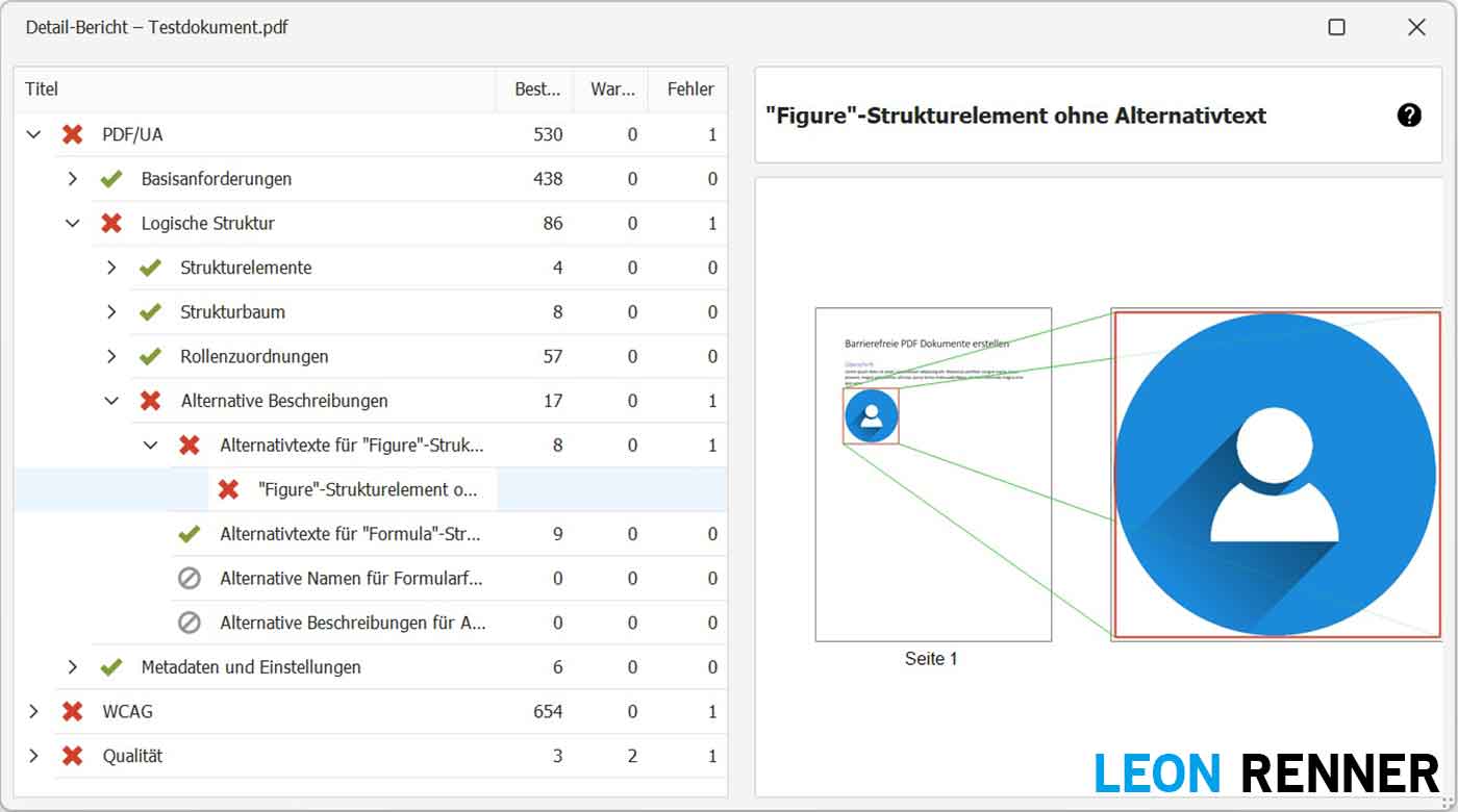 Sobald Sie das Dokument abspeichern und erneut mit dem PDF Accessibility Checker prüfen, ist die Fehlermeldung “Figure”-Strukturelement ohne Alternativtext verschwunden.