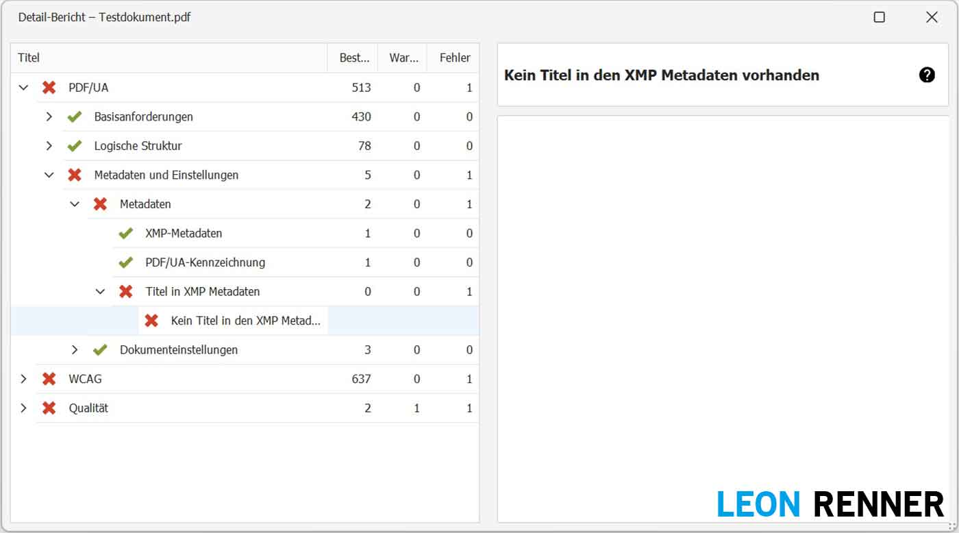 Sobald Sie das Dokument abspeichern und erneut mit dem PDF Accessibility Checker prüfen, ist die Fehlermeldung Kein Titel in den XMP Metadaten vorhanden verschwunden.