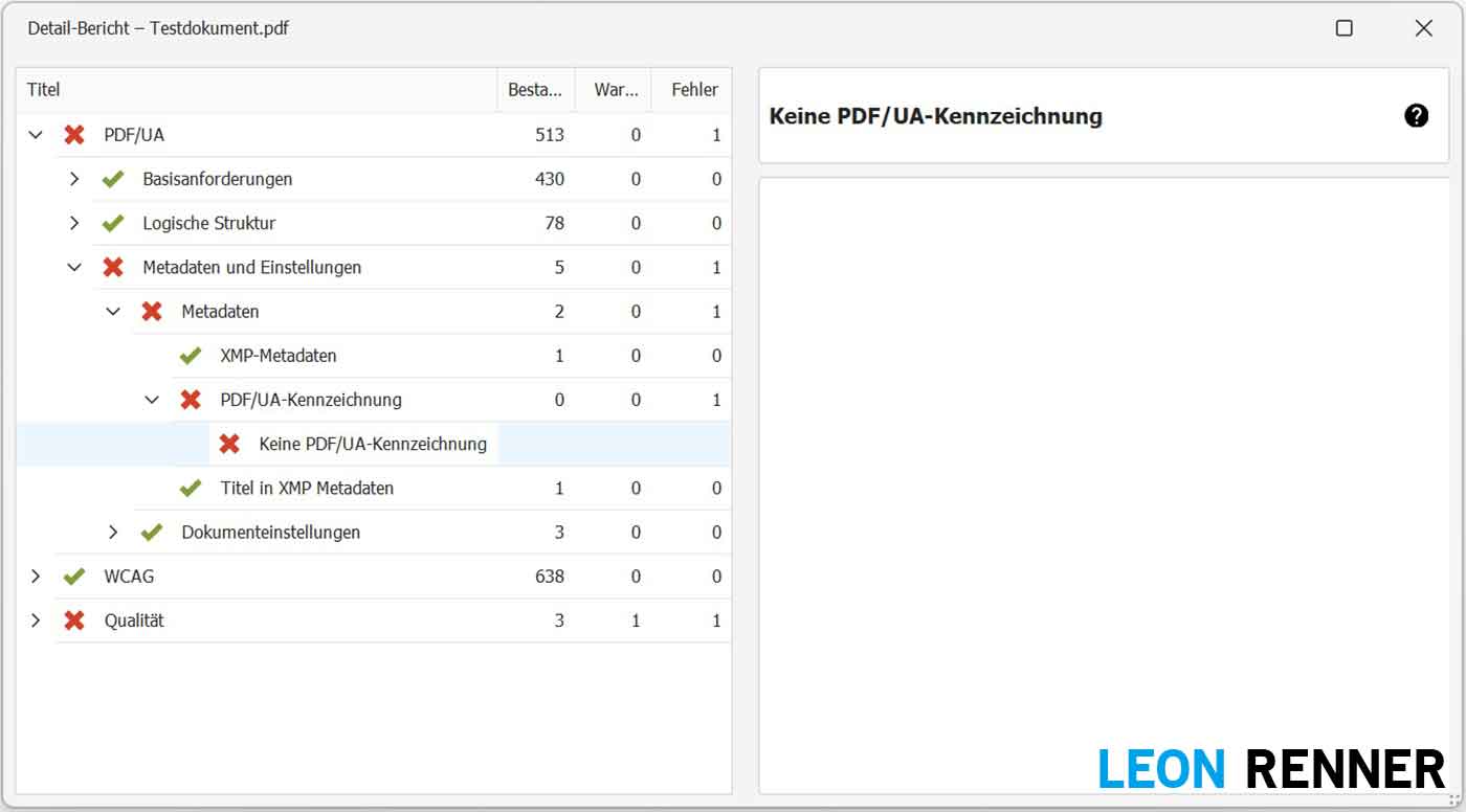 Sobald Sie das Dokument abspeichern und erneut mit dem PDF Accessibility Checker prüfen, ist die Fehlermeldung Keine PDF/UA-Kennzeichnung verschwunden.