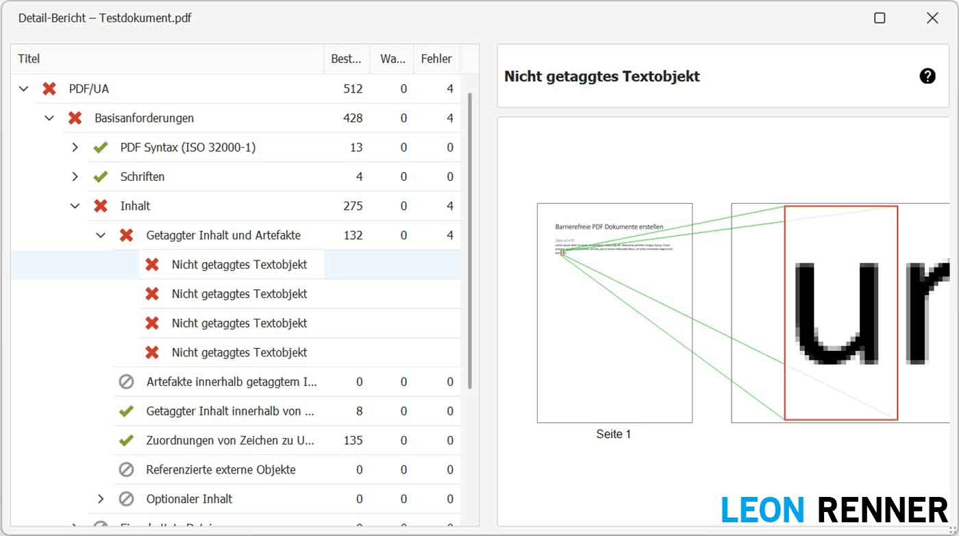 Sobald Sie das Dokument abspeichern und erneut mit dem PDF Accessibility Checker prüfen, ist die Fehlermeldung Nicht getaggtes Textobjekt verschwunden.